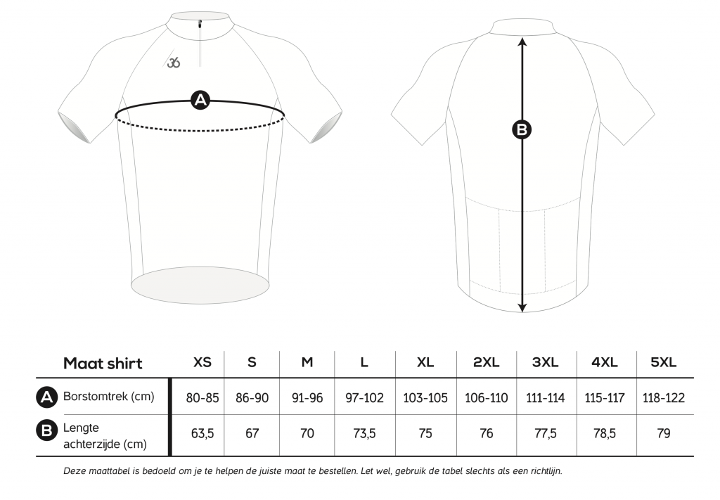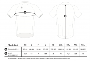 Bepaal uw maat aan de hand van de onderstaande tabel en geef uw maat door bij uw inschrijving. U ontvangt uw wielershirt op vrijdag 6 juni 2025 voorafgaand aan de start van uw route.